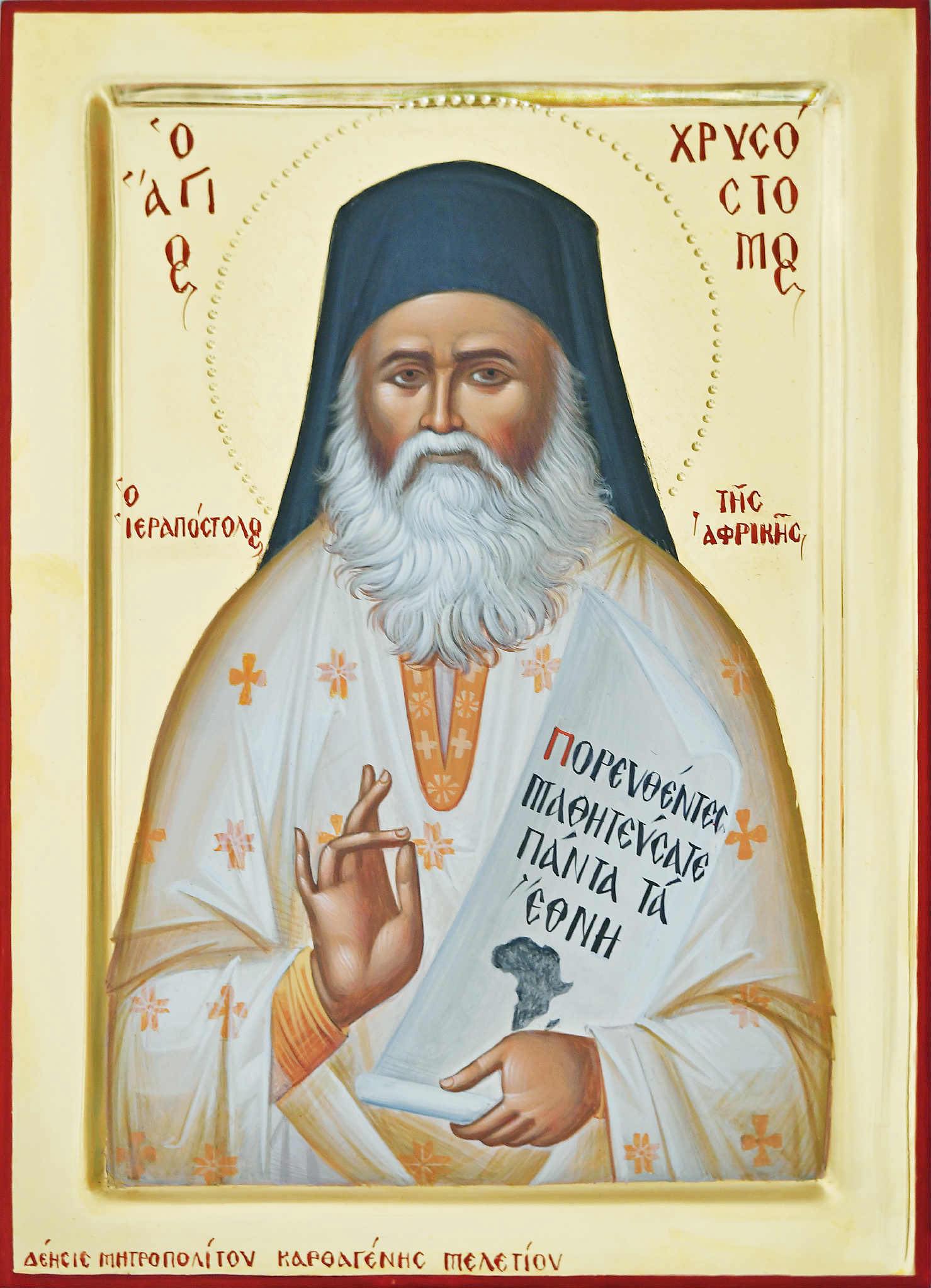 Λαός σε Ὁρθοδόξων ἀνευφημεῖ, εὐλαβῶς θεομάκαρ Χρυσόστομε, χαίροις βοῶν, θείων Ἀποστόλων ὁ μιμητής, καὶ θεοκῆρυξ ὅσιος, τῆς Ὀρθοδοξίας ἐν Ἀφρικῇ· Θεὸν οὖν ἱκετεύων, μὴ παύσῃ τοῦ φυλάττειν, τὴν Ἐκκλησίαν εἰρηνεύουσαν.
