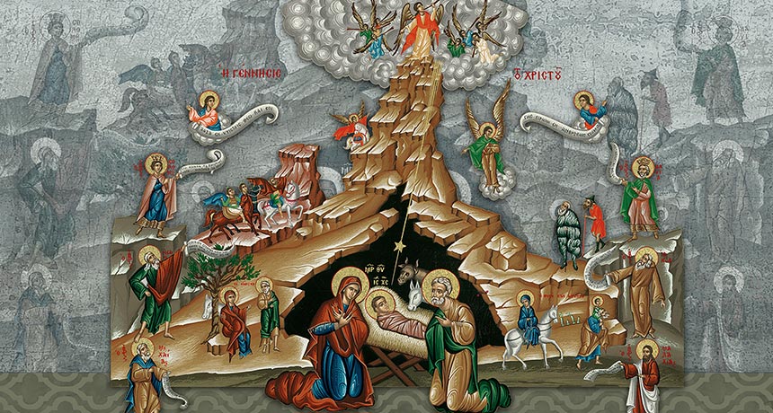 Θεὸς ἐν φάτνῃ ἀνακλίνεται, ὁ στερεώσας τοὺς οὐρανοὺς πάλαι κατ’ ἀρχάς.