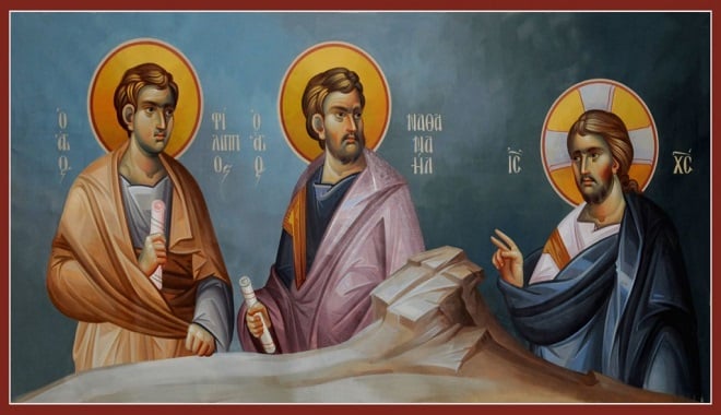 Εκείνο τον καιρό ο Ιησούς να πάει στη Γαλιλαία. Βρίσκει τότε το Φίλιππο και του λέει: «Έλα μαζί μου». 0 Φίλιππος καταγόταν από τη Βηθσαϊδά, την πατρίδα του Ανδρέα και του Πέτρου. Βρίσκει ο Φίλιππος το Ναθαναήλ και του λέει: «Αυτόν που προανάγγειλε ο Μωυσής στο νόμο, και οι προφήτες, τον βρήκαμε· είναι ο Ιησούς, ο γιος του Ιωσήφ από τη Ναζαρέτ». «Μπορείς από τη Ναζαρέτ να βγει κάτι καλό;» τον ρώτησε ο Ναθαναήλ. «Έλα και δες μόνος σου», του λέει ο Φίλιππος. Ο Ιησούς είδε το Ναθαναήλ να πλησιάζει και λέει γι' αυτόν: «Να ένας γνήσιος Ισραηλίτης, χωρίς δόλο μέσα του». «Από πού με ξέρεις;» τον ρωτάει ο Ναθαναήλ. Κι ο Ιησούς του απάντησε: «Προτού σου πει ο Φίλιππος να 'ρθείς, σε είδα που ήσουν κάτω απ' τη συκιά». Τότε ο Ναθαναήλ του είπε: «Διδάσκαλε, εσύ είσαι ο Υιός του Θεού, είσαι ο βασιλιάς του Ισραήλ». Κι ο Ιησούς του αποκρίθηκε: «Επειδή σου είπα πως είδα κάτω από τη συκιά, γι' αυτό πιστεύεις; Θα δεις μεγαλύτερα πράγματα απ' αυτά». Και του λέει: «Σας βεβαιώνω ότι σύντομα θα δείτε να ανοίξει ο ουρανός, και οι άγγελοι του Θεού να ανεβαίνουν και να κατεβαίνουν πάνω στον Υιό του Ανθρώπου.