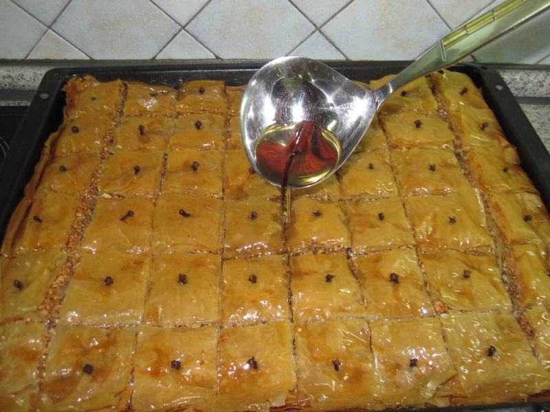 Συνεχίζετε με φύλλο-γέμιση έως ότου τελειώσουν. Φροντίζετε πάνω-πάνω να κρατήσετε 3 φύλλα κρούστας χωρίς γέμιση. Κόβετε το γλυκό σε κομμάτια και σε κάθε κομμάτι καρφώνετε ένα γαρύφαλλο.
