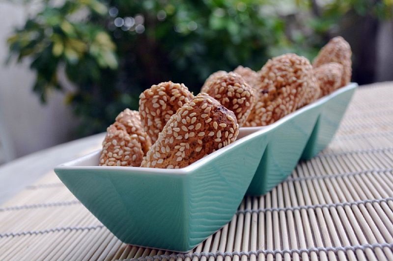 Σε ένα σκεύος ανακατεύουμε το ταχίνι, τη ζάχαρη και το χυμό, μέχρι να ενωθούν καλά. Προσθέτουμε το ξύσμα πορτοκαλιού, το λικέρ, το μπέικιν και σιγά σιγά το αλεύρι. Αν δούμε πολύ μαλακή τη ζύμη, προσθέτουμε κι άλλο αλεύρι. Θέλουμε μια μαλακή ζύμη, εύπλαστη, που να μην κολλάει στα χέρια μας. Πλάθουμε από τη ζύμη μπαλάκια στο μέγεθος ενός καρυδιού και τα βουτάμε στο σουσάμι. Τα αραδιάζουμε σε ταψί, στο οποίο έχουμε στρώσει μια λαδόκολλα, και πατάμε με το δάχτυλό μας πάνω σε κάθε κουλουράκι, σαν να βάζουμε το αποτύπωμα του δαχτύλου μας. Ψήνουμε σε προθερμασμένο φούρνο στους 180οC για 20 λεπτά. Όταν τα βγάλουμε απ’ το φούρνο, θα είναι μαλακά ακόμα. Όσο θα κρυώνουν, θα σφίγγουν.