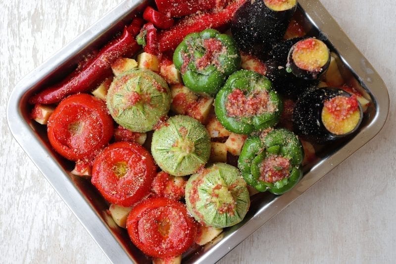 Κλείνουμε τα λαχανικά με τα καπάκια τους και τα τοποθετούμε όρθια σε ένα βαθύ ταψί του φούρνο, εκτός από τις πιπεριές Φλωρίνης που τις τοποθετούμε ξαπλωτές.