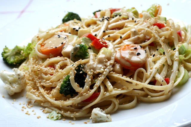 Ανακατεύουμε και σερβίρουμε, προσθέτοντας καρβουνιασμένο σησάμι, μαϊντανό και μία κουταλιά ταχίνι πάνω από τα μακαρόνια σε κάθε πιάτο.