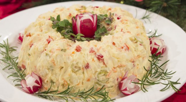 Λαχταριστή, πεντανόστιμη πατατοσαλάτα για να την απολαύσετε εσείς και οι καλεσμένοι σας στο γιορτινό τραπέζι σας. Μια απλή και εύκολη για μια ξεχωριστή πατατοσαλάτα με πλούσια γεύση και εξαιρετική εμφάνιση, ιδανική για τα επίσημα τραπέζια σας. Φτιάξτε τη από τη προηγούμενη ημέρα αφήστε τη στο ψυγείο και τη ξεφορμάρετε και στολίζετε λίγο πριν τη σερβίρετε. Απολαύστε τη!