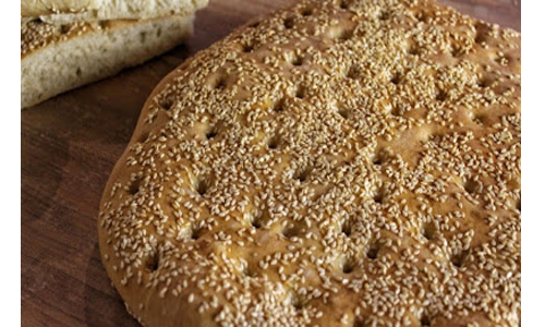 Αλείφουμε με λίγο νερό την επιφάνεια της λαγάνας, πασπαλίζουμε με όσο σουσάμι θέλουμε και ψήνουμε για περίπου 40 λεπτά, μέχρι να ροδίσει