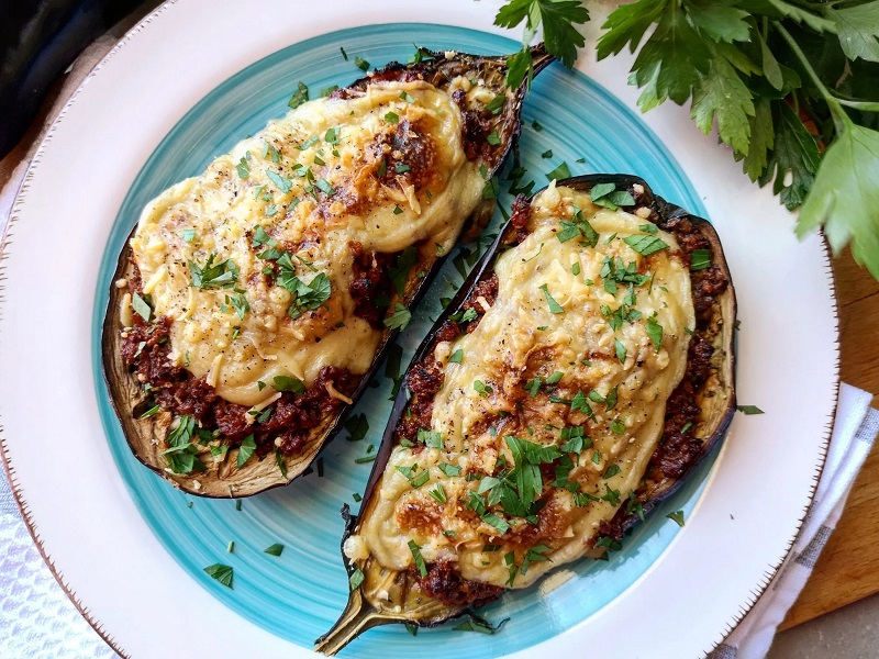 Περιχύνουμε ένα ταψί με το υπόλοιπο ελαιόλαδο (¼ φλιτζ.) και απλώνουμε τις μελιτζάνες δίπλα τη μια με την άλλη, πιέζουμε τη σάρκα τους ελαφρώς με κουτάλι και τις γεμίζουμε με το μείγμα του κιμά.