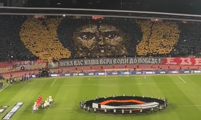Λίγο πριν από τη σέντρα, οι φανατικοί οπαδοί -και αδελφοποιημένοι με τη Θύρα 7 του Ολυμπιακού– των Σέρβων που παρουσίασαν ένα εντυπωσιακό coreo που κάλυψε ολόκληρη την κερκίδα. Στο κέντρο να δεσπόζει η εικόνα του Αγίου Συμεών του Μυροβλύτη, μια μορφή με ιδιαίτερη σημασία για τους οργανωμένους οπαδούς του συλλόγου, τους γνωστούς Delije.