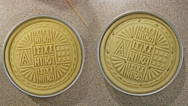 Κύριε Σὲ εὐχαριστῶ γι᾿ αὐτὴν τὴν ἅγια ὥρα, ποὺ μὲ τὰ ἁμαρτωλά μου χέρια μὲ ἀξιώνεις νὰ ζυμώνω τὰ Πανάχραντα Δῶρα τῆς ἀγάπης Σου. Σὲ παρακαλῶ κατάπεμψε τὸ Πανάγιό Σου Πνεῦμα ποὺ εὐλογεῖ ὅλα τὰ Μυστήρια τῆς Ἐκκλησίας, νὰ εὐλογήσει καὶ τοῦτα τὰ Δῶρα γιὰ νὰ γίνουν καλὰ καὶ εὐπρόσδεκτα στὸ Ἅγιό Σου θυσιαστήριο. Καὶ σὲ παρακαλῶ νὰ τὰ δεχθῇς ὅπως ἐδέχθης τὴ θυσία τοῦ Ἄβελ, τὴ δοξολογία τῶν Ποιμένων, τὰ δῶρα τῶν Μάγων, τὰ δάκρυα τοῦ Πέτρου, καὶ τοῦ Ληστοῦ τὴν μετάνοιαν. Καὶ ἂς μὲ ἀξιώνεις νὰ σοῦ τὰ προσφέρω πάντοτε εὐσυνείδητα. Ἀμήν.